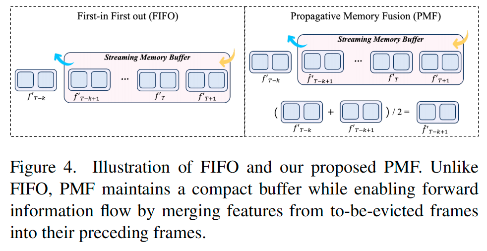 长时上下文信息对于预测目标的潜在行为和轨迹至关重要,进而实现更安全的自动驾驶。然而,存储和处理连续流式数据不可避免地会导致计算开销呈指数增长,并可能引发内存溢出。为解决这些挑战,我们提出一种固定大小的流式内存缓冲区,结合传播式内存融合(PMF)策略管理历史驾驶数据。与仅保留固定长度特征的先进先出(FIFO)机制不同,我们的PMF机制通过将待淘汰帧的特征合并到其前一帧中保存信息,在维持紧凑缓冲区的同时实现信息的前向传播,公式如下:
