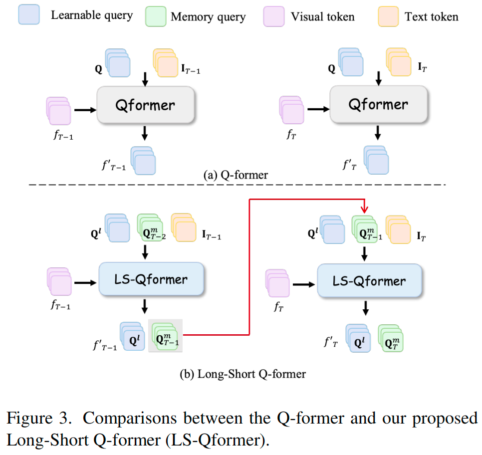 其中 是用于特征聚合的额外可学习令牌。然而,该模块单独处理每帧图像,忽略了长时时序信息。为解决这一问题,我们提出长短时Q转换器(LS-Qformer)。受分组机制启发,我们将可学习令牌分为两组,记为 和 : 传递到下一帧以聚合长时信息,而 与标准Q转换器类似,专注于当前帧信息。公式如下: