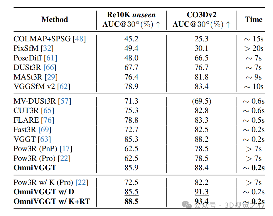加相机参数:CO3Dv2的AUC@30°达93.4%,远超Pow3R的82.2%;