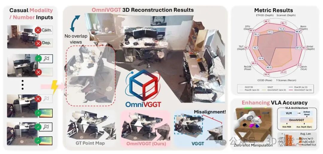 实验表明,OmniVGGT在单目/多视图深度估计、多视图立体匹配、相机位姿估计等任务上都达到顶尖水平,甚至只用RGB输入也比现有方法好。更实用的是,把它集成到视觉-语言-动作(VLA)模型中,还能显著提升机器人操作任务的性能。