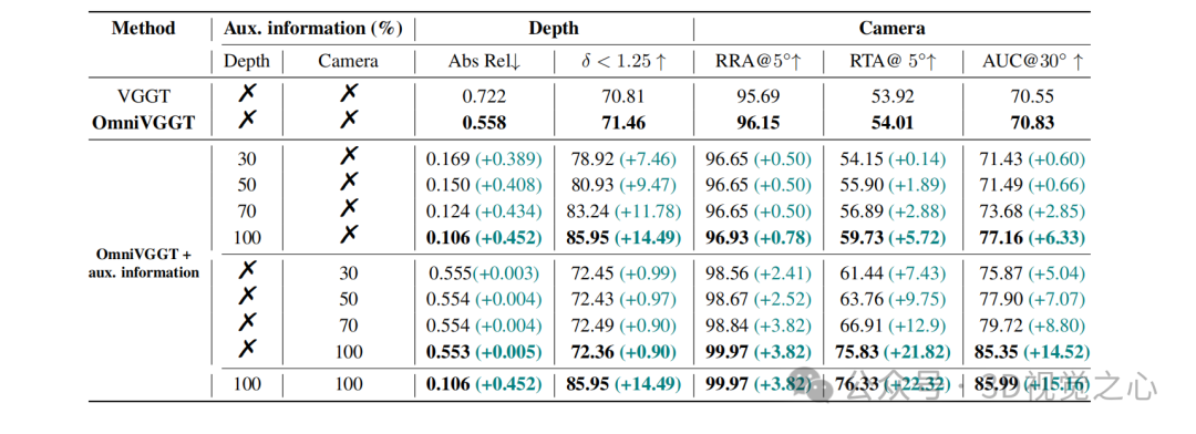 加100%相机+100%深度信息:相机位姿的AUC@30°达85.99%,比无辅助信息提升15.16%;