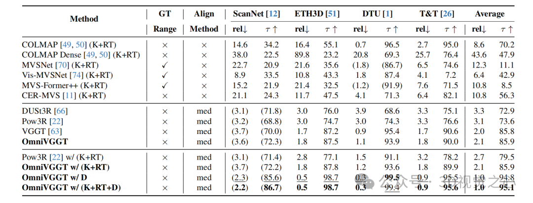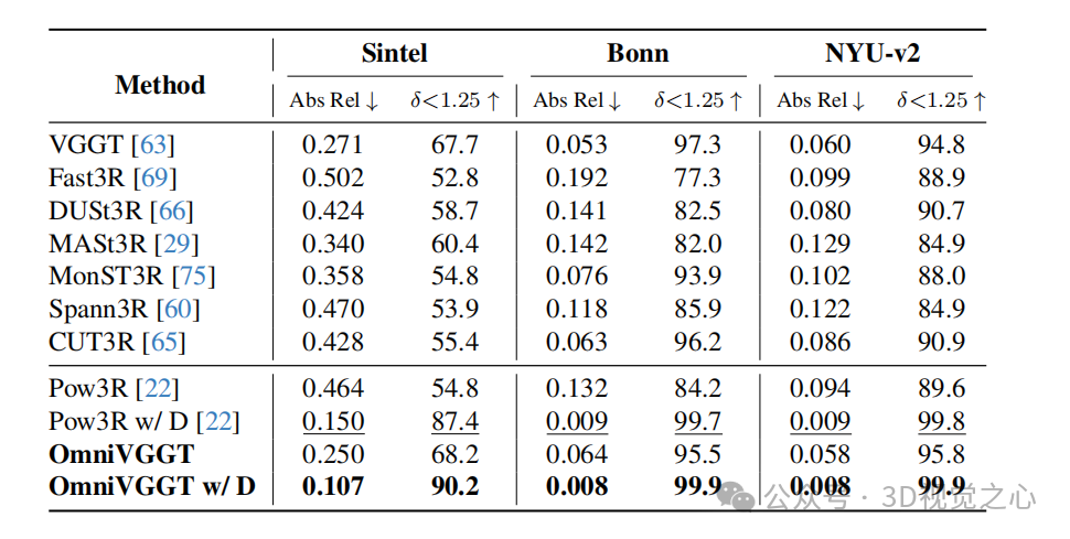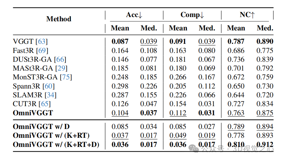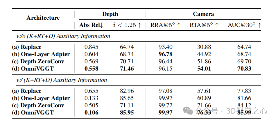 完整OmniVGGT:各项指标最优,证明零卷积注入相机信息、直接注入深度信息的设计最合理。
