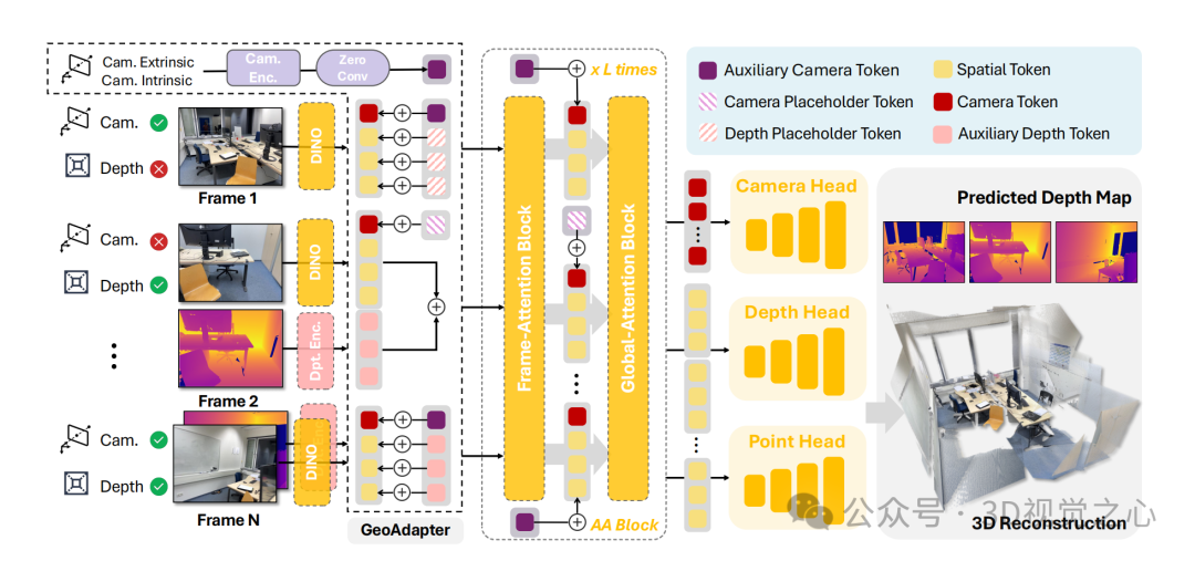 GeoAdapter(几何适配器):用零初始化卷积将深度、相机参数等几何信息逐步注入基础模型,不破坏原有特征空间,计算开销极小,推理速度和原模型VGGT差不多;