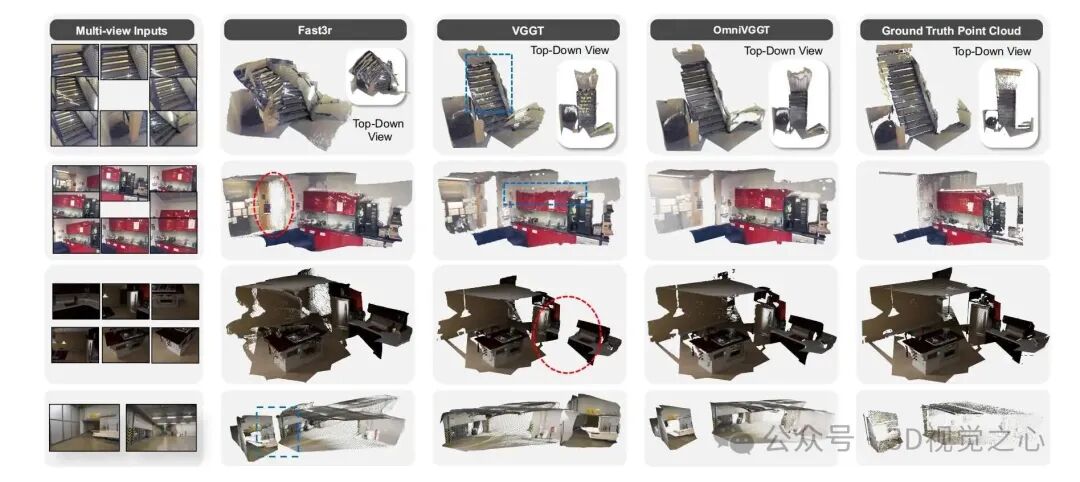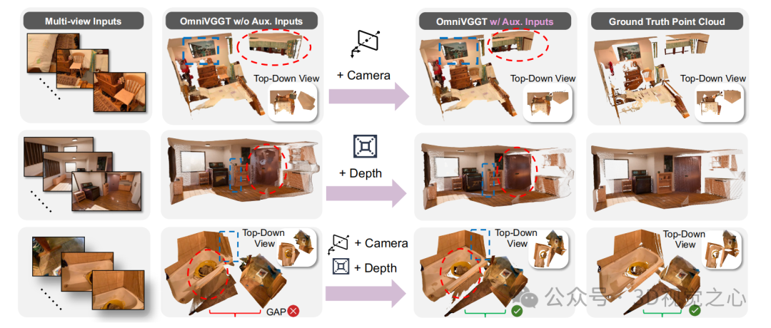 这张图展示了极端场景的表现:即使图像几乎无重叠,OmniVGGT加辅助信息后也能保持准确的空间关系和几何一致性,重建效果比其他方法更逼真。