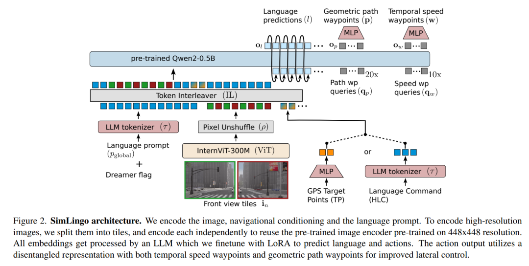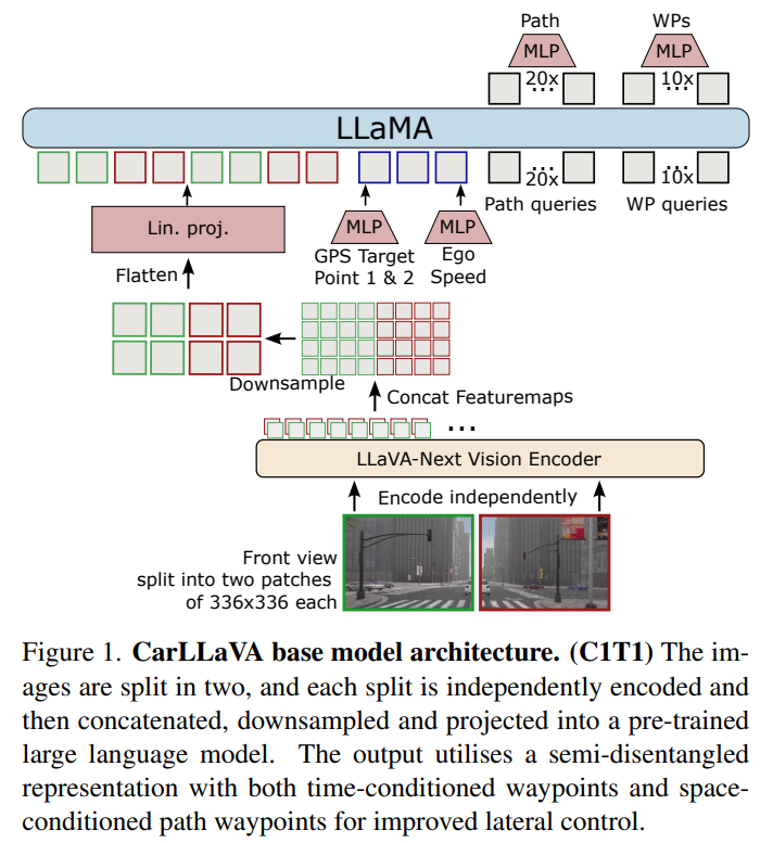 架构设计:模型采用 LLaVA-NeXT 的视觉编码器和 LLaMA 架构作为主干。为了应对驾驶任务对细节的高要求(如识别远处的交通灯),它采用了高分辨率图像输入和分块处理技术。模型输入包括前置摄像头图像、下一个目标点和自车速度。