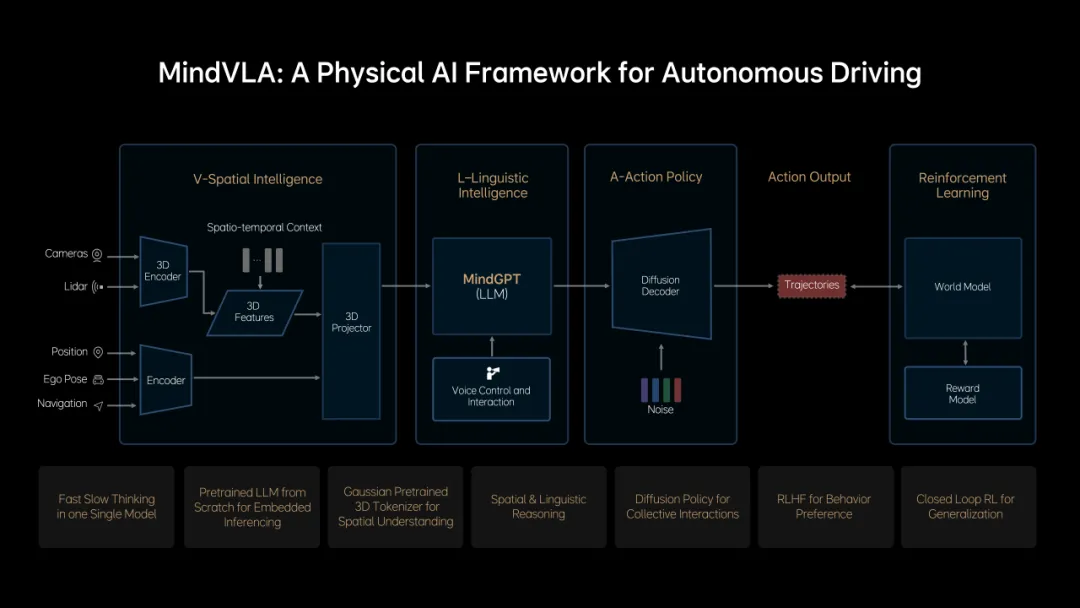 模型类型:他们用的是 VLA 模型,也就是所谓的视觉-语言-行动模型。这个模型把端到端驾驶模型和视觉语言模型的能力结合在了一起。他们自研的MindVLA模型,融合了空间智能、语言智能,还有行为智能。