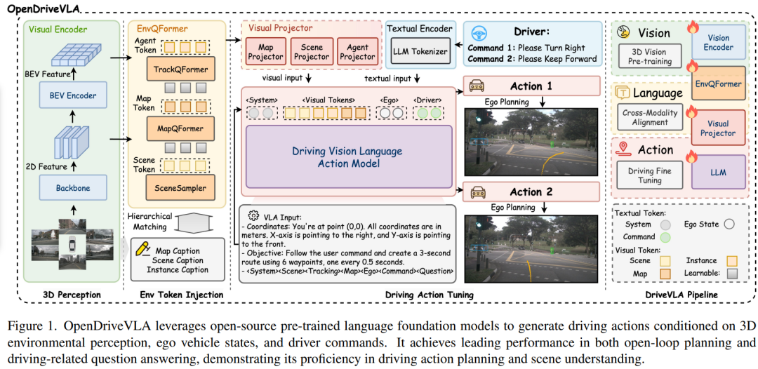 论文内容:本文提出 OpenDriveVLA,这是一个基于视觉-语言-动作模型的端到端自动驾驶框架。它以开源预训练的视觉语言模型为基础,把多视角图像、3D环境信息、自车状态和驾驶指令都融合在一起,最终输出可靠的未来轨迹。模型的核心创新点有这么几个: