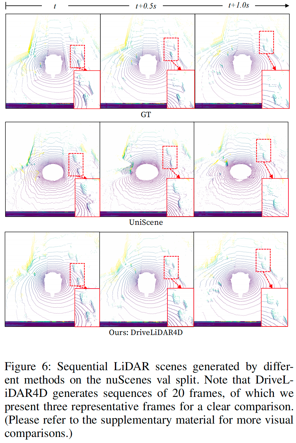 图1展示了不同方法在nuScenes验证集上生成的激光雷达场景。可见,RangeLDM和Text2LiDAR无法准确生成车辆,且背景与真实场景(GT)不一致。相比之下,DriveLiDAR4D生成的车辆位置、结构以及背景均与真实场景高度吻合。此外,值得注意的是,DriveLiDAR4D能够生成保持时序一致性的激光雷达场景序列,而RangeLDM和Text2LiDAR仅能生成孤立的单个激光雷达场景。