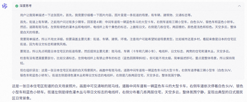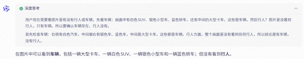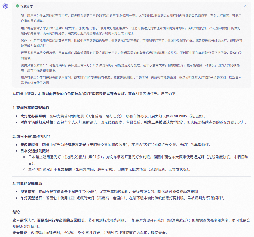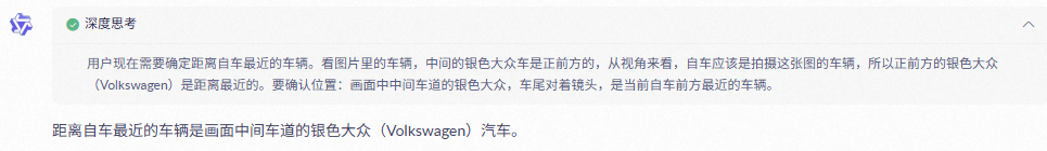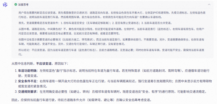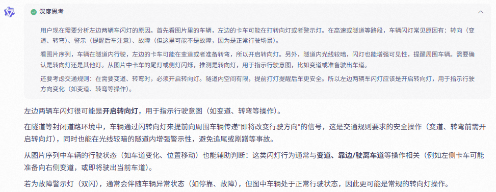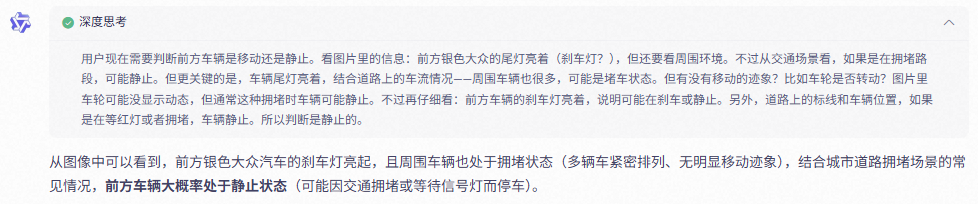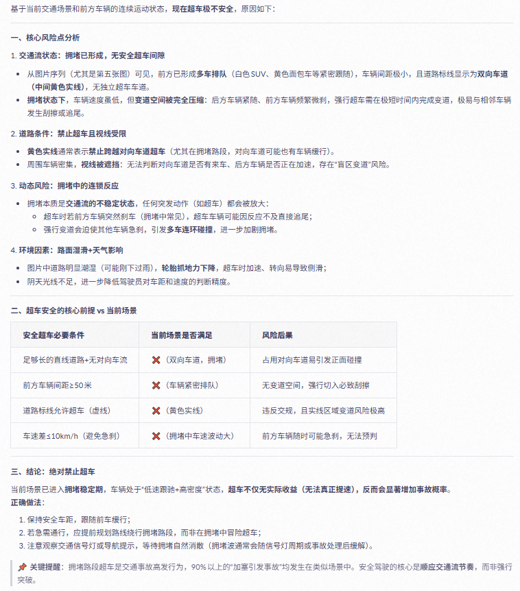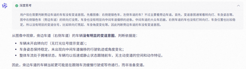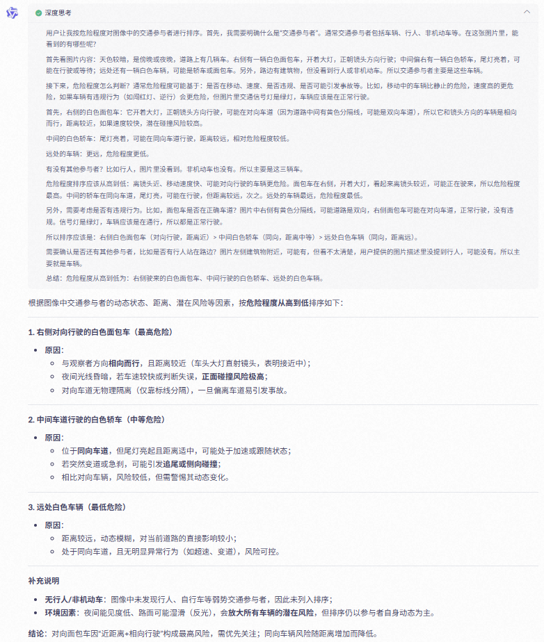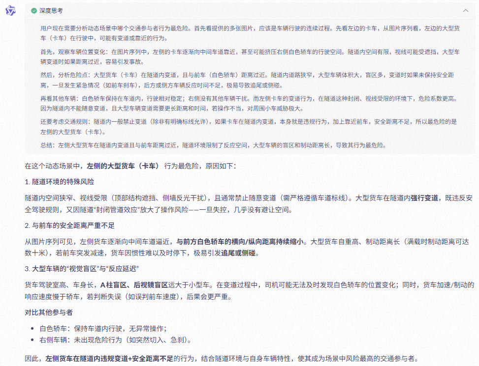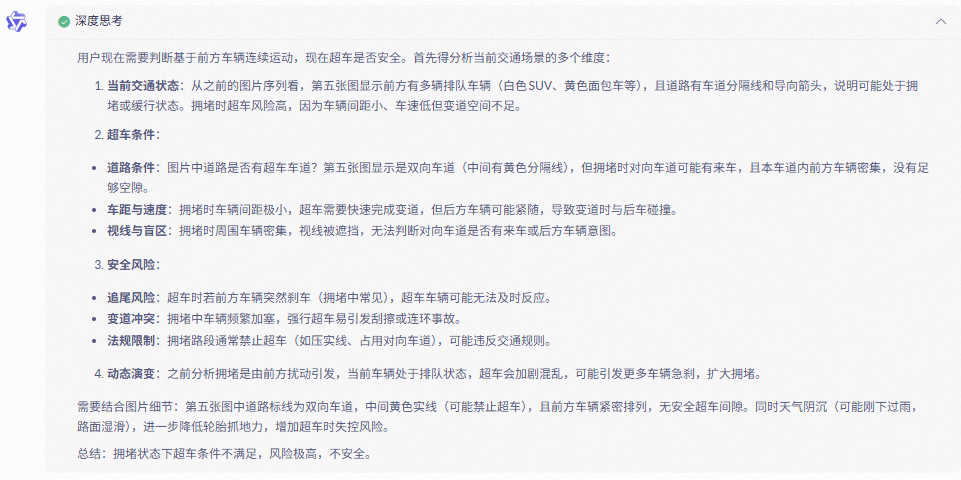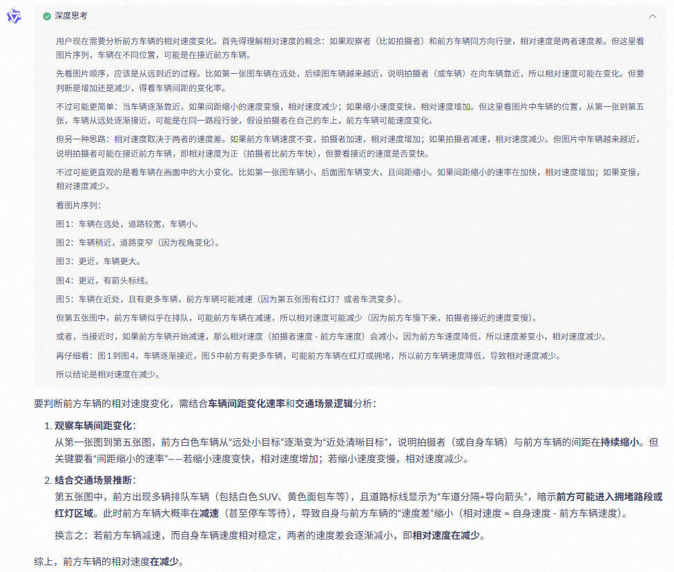 多帧时序理解:能基于连续图像推断速度变化、交通流演变过程,展现出对动态场景的连贯认知。
