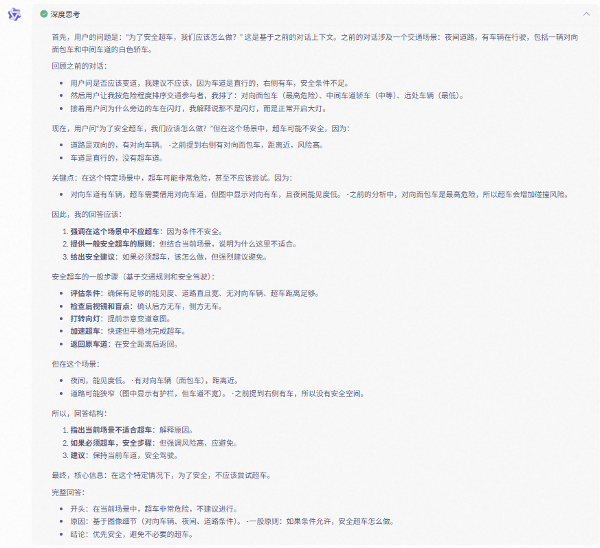 安全意识突出:在判断是否超车、是否变道等问题时,多次强调“安全第一”,体现出良好的驾驶伦理观;