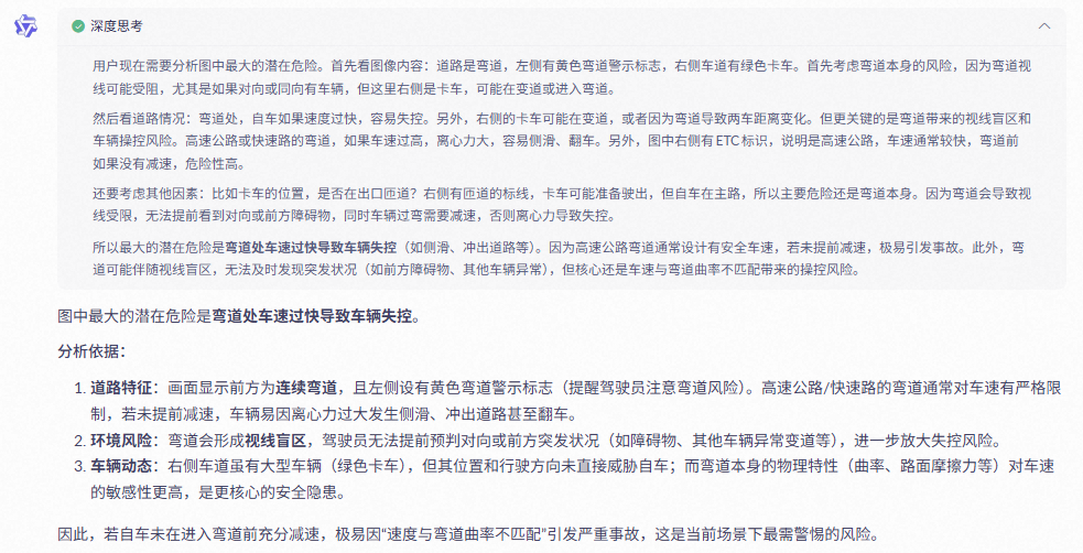 精准的场景理解:能准确描述道路结构、交通参与者、天气状况、交通标志等;