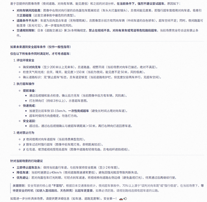 更重要的是,它并未经过专门的自动驾驶指令微调(SFT),却能对复杂交通场景做出合理、连贯、甚至带有“安全意识”的判断——这让我们看到了通用视觉语言模型在垂直领域中落地的更多可能。