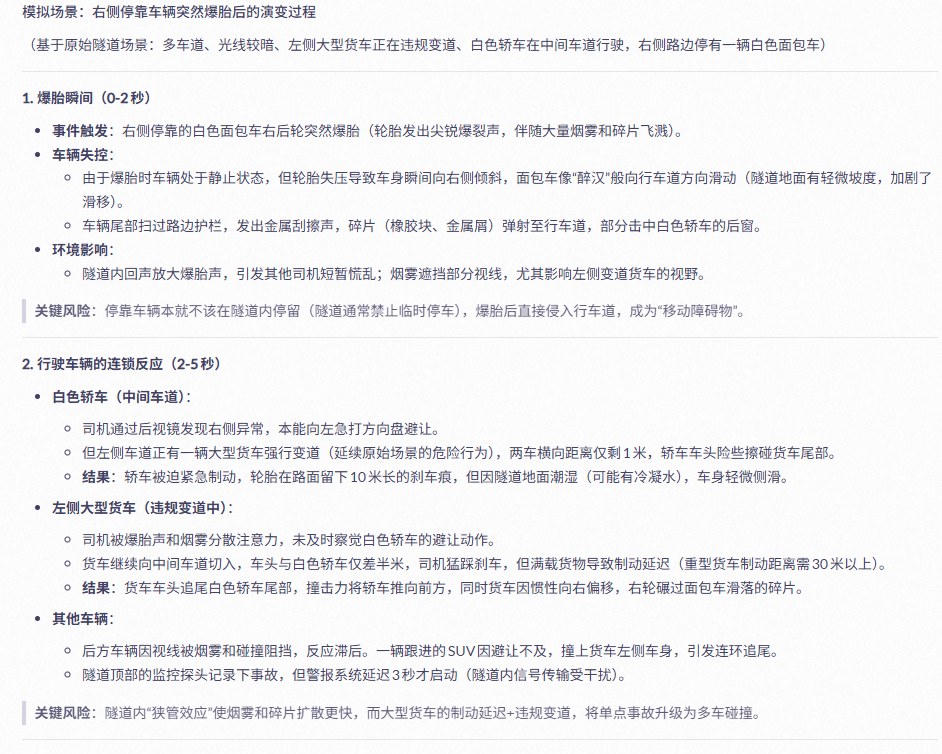 👨🎓:请模拟一下,如果旁边停靠的车辆突然爆胎,整个场景会如何演变?