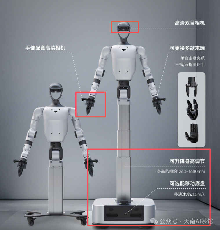 整体变得不多,砍掉了G1的双腿,手部从假手套换成了配备高清相机的夹爪,而且增加了高清双目相机。