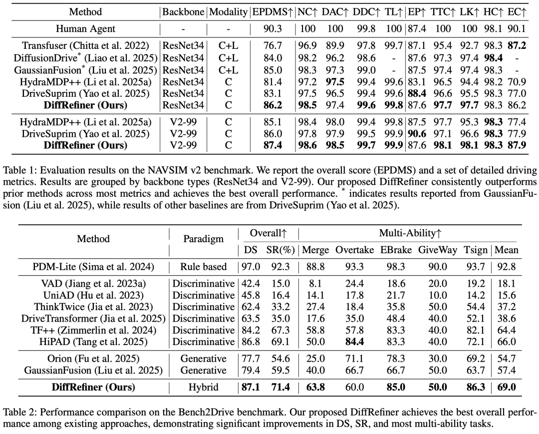 DiffRefiner在开环真实世界基准测试NAVSIM v2和闭环仿真基准测试Bench2Drive上均取得了当前最优(SOTA)性能。