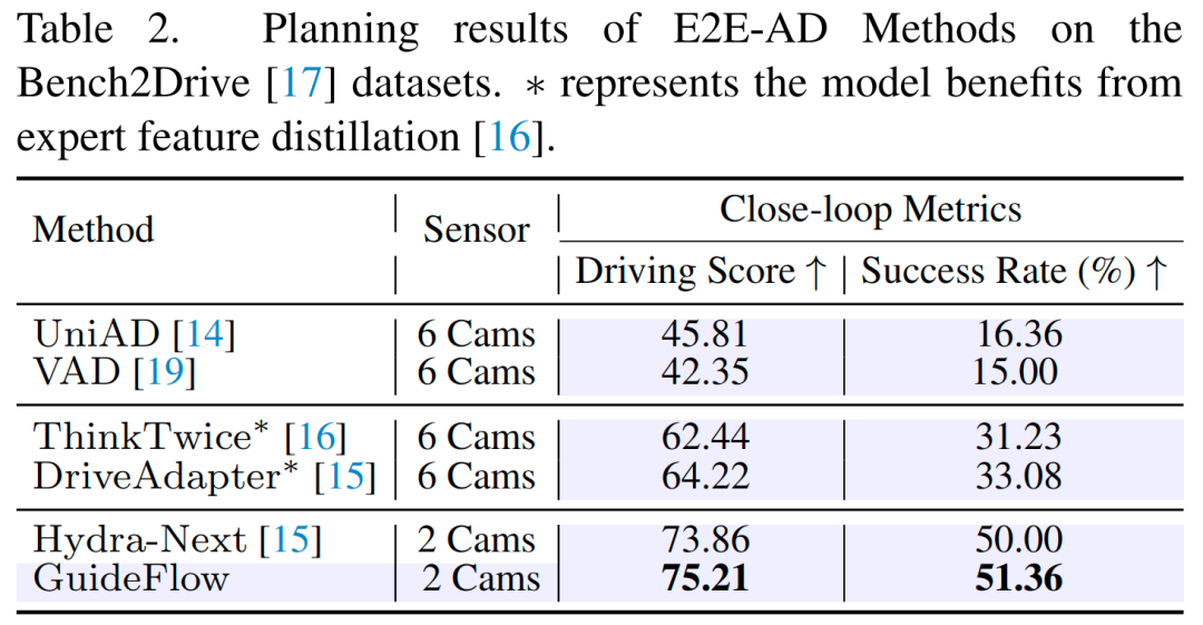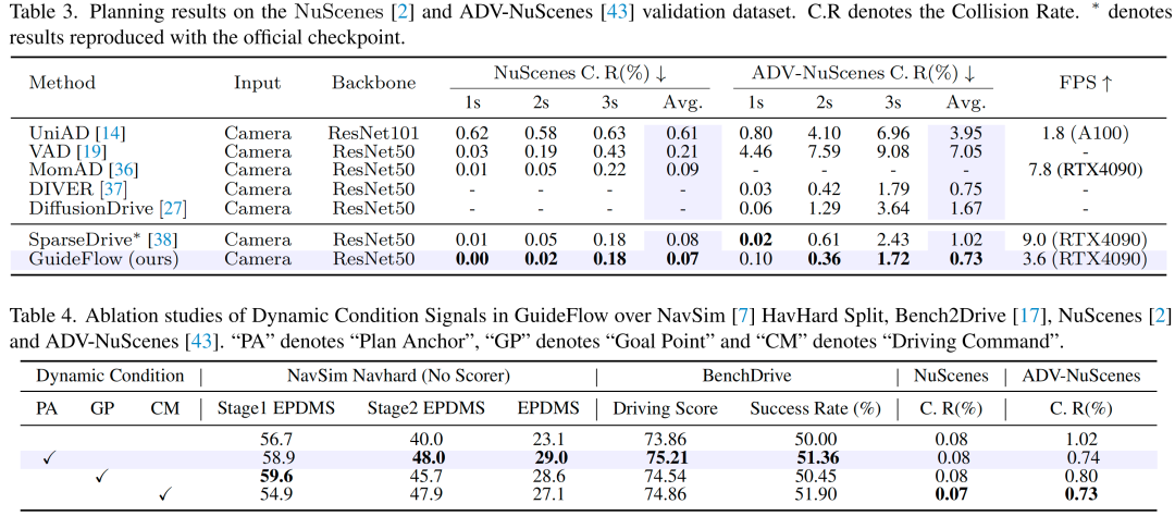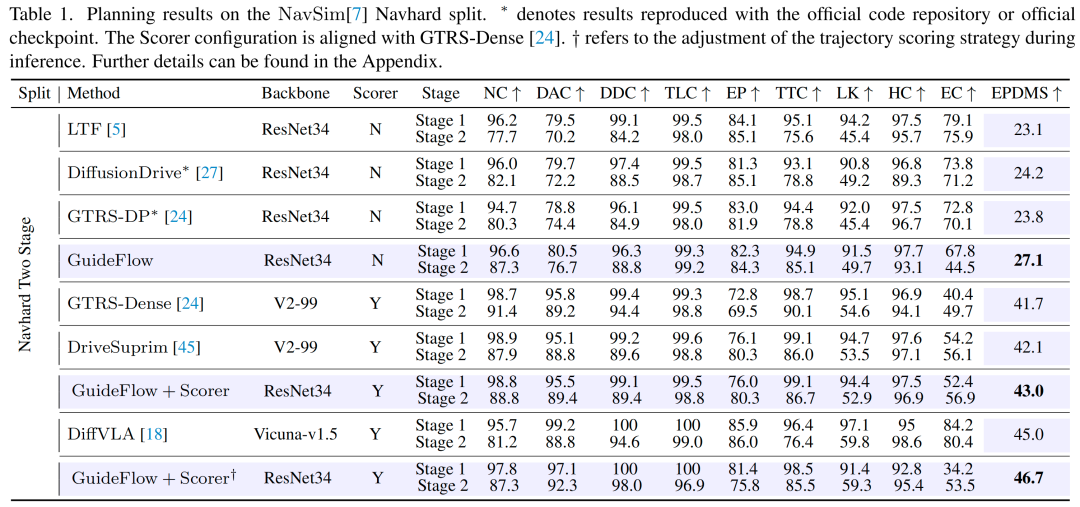 在自动驾驶数据集(NuScenes、ADV-NuScenes、NavSim和Bench2Drive)上的大量实验验证了其优异性能。值得注意的是,在NavSim测试集的高难度子集(Navhard)上,GuideFlow取得当前最优结果,EPDMS分数达43.0。