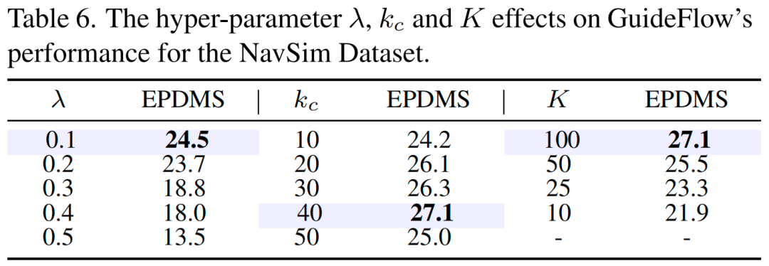 超参数λ的影响:当λ从0.1增至0.5时,EPDMS评分持续下降。性能下降并非源于约束策略本身,而是由于对预测速度场的过度干扰,破坏了流的平滑性并降低了轨迹质量。