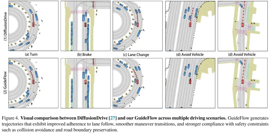 如图4所示,在多种驾驶场景下的视觉对比表明,本文提出的GuideFlow方法相比DiffusionDrive具有显著优势:GuideFlow能生成满足约束的轨迹,在大幅降低碰撞风险的同时,严格遵守车道行驶规则。具体而言: