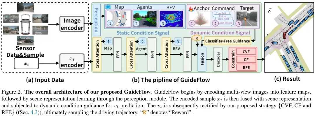 本文提出了一种基于流匹配的规划框架GuideFlow。该方法的核心在于:通过融入驾驶指令、目标点、规划锚点等多种条件信号,引导生成过程向场景感知型行为演进;此外,本文创新性地提出三种策略,在生成过程中执行显式约束。