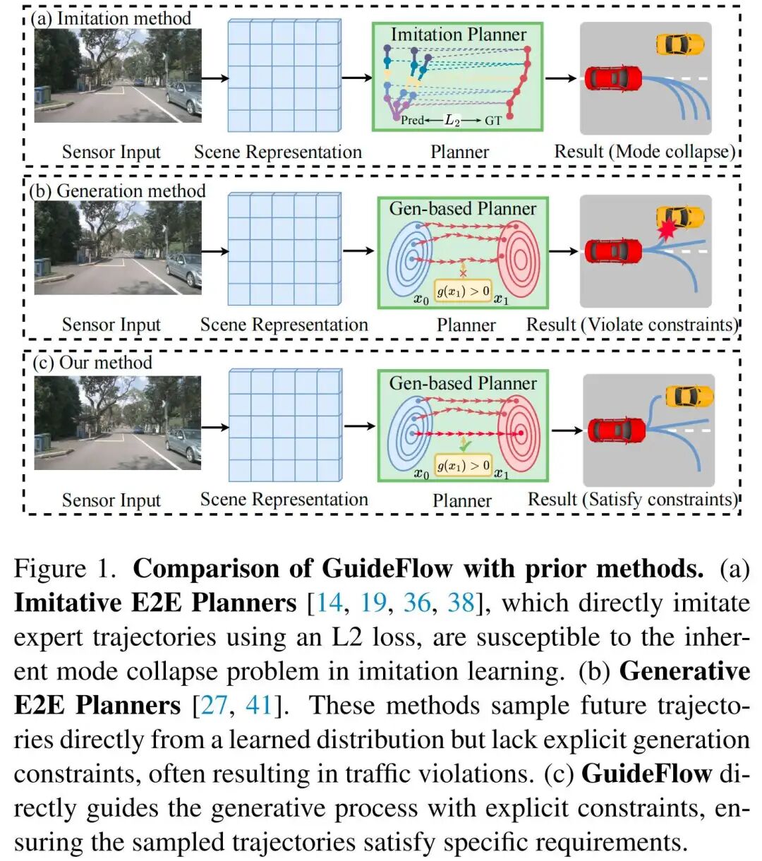 近年来,端到端自动驾驶规划技术已从单模态轨迹生成向多模态轨迹生成演进,以更好地反映真实驾驶场景中的固有不确定性。在许多场景中,往往存在多种合理的驾驶意图,但单模态端到端自动驾驶规划器仅能输出一条确定性路径,限制了系统的鲁棒性。相比之下,多模态端到端自动驾驶规划方法会预测多条候选轨迹,提供更丰富的意图表达。然而,如图1所示,这些方法大多仍基于模仿学习(IL)进行训练。由于每个驾驶场景仅提供一条真实轨迹(GT),模型学习到的多模态输出往往会向单一主导模式收敛——尽管名义上具备多样性,但最终预测结果高度相似。这种现象被称为模式崩溃。为缓解模式崩溃问题,近期研究探索将生成式建模用于轨迹规划。生成式方法(流匹配和扩散模型)旨在表征可行未来轨迹的完整分布,通过迭代采样自然实现多样化的轨迹假设。尽管生成式方法提升了多模态轨迹预测性能,但采样过程中固有的随机性和高方差,给保证生成轨迹满足严格安全约束带来了根本性挑战。当前方法极少探索在生成过程中融入显式的风格引导和安全引导以确保约束满足,这给系统的可靠部署带来了难题。