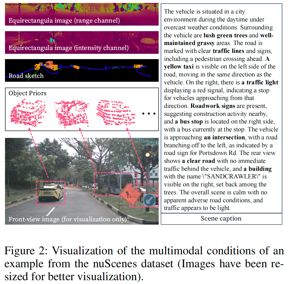场景描述:除通过道路草图实现前景控制外,我们还提出使用场景描述对背景进行全面描述。然而,现有激光雷达数据集缺乏高质量场景描述:KITTI-360数据集未包含任何场景描述,nuScenes数据集仅提供关于天气或时段的单句简短描述。因此,我们利用强大的视觉-语言模型GPT-4V生成详细场景描述——具体而言,将周围图像输入GPT-4V,并要求其生成所描绘场景的描述文本。图2展示了nuScenes数据集中场景描述条件的示例,该示例中的场景描述不仅包含前景物体“出租车”,还涵盖“树木”“草地”等背景元素。