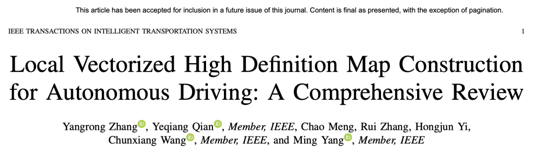 上海交通大学智能网联电动汽车创新中心团队在钱烨强和杨明老师指导下,于智能交通领域旗舰期刊IEEE Transactions on Intelligent Transportation Systems(T-ITS)上发表题为“Local Vectorized High Definition Map Construction for Autonomous Driving: A Comprehensive Review”的综述论文。文章系统梳理了局部矢量化高精地图构建(LV-HDMC)的演进脉络,将“真值制作—网络结构—评测基准”纳入统一任务框架进行全景式剖析。通过归纳现有范式在特征提取与地图解码环节的网络结构差异,辅以详尽的定性定量对比,系统揭示了各类方法在精度、效率与鲁棒性上的具体表现。在此基础上,文章进一步指出当前局部建图领域的关键瓶颈,并给出可扩展、可落地的研究路线,为自动驾驶局部建图技术提供新的理论视角与实践路径。本文第一作者是自动化与感知学院2023级硕士生张洋榕。