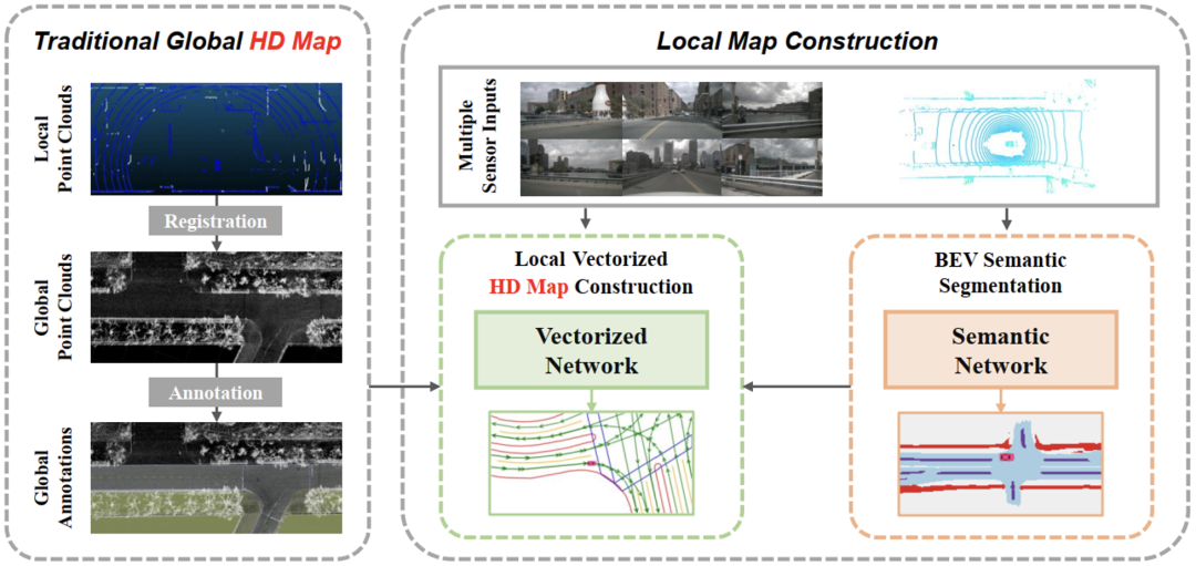 为了展示高精地图构建任务的发展脉络,综述首先回顾了局部矢量建图出现之前的相关研究工作,涵盖传统测绘手段以及近期基于局部语义栅格地图的方法;随后深入解析局部矢量建图任务,阐明其与早期任务在目标、表征与输出格式上的异同。