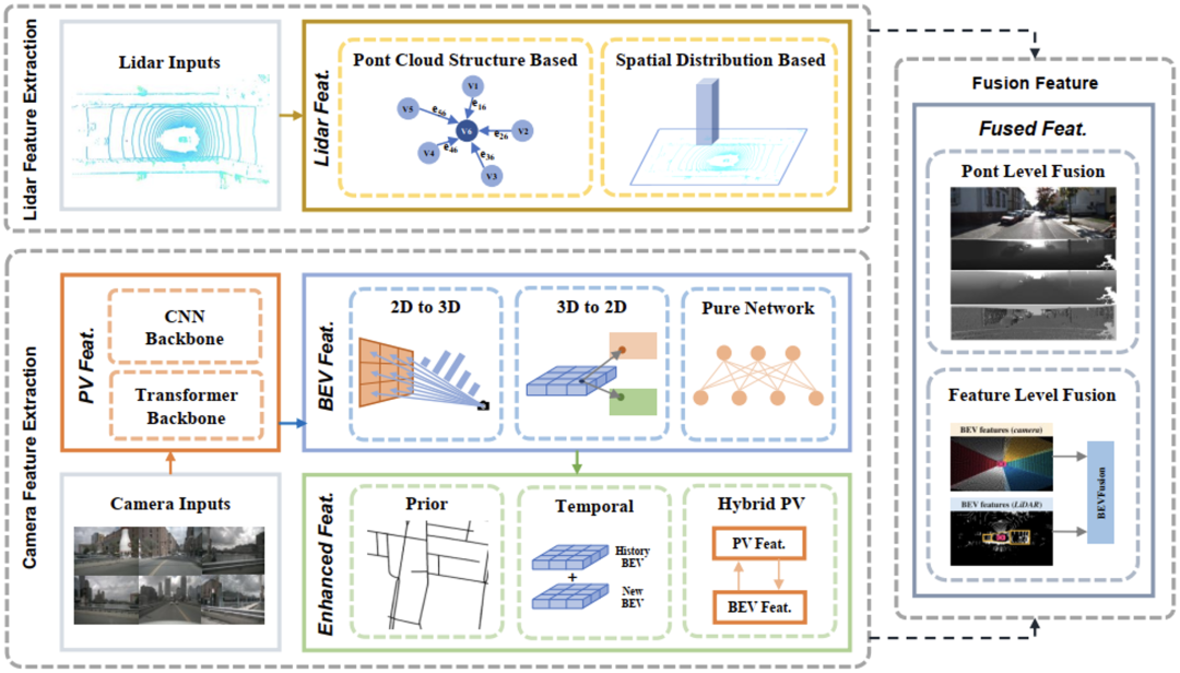 同时,由于当前主流模型普遍遵循“特征提取—特征解码”的固定范式,本综述系统梳理了现有方法的网络结构,重点分析特征提取与地图解码两大模块。在特征提取方面,综述依据传感器输入模态对现有方法进行分类;在地图解码方面,则进一步区分为常规地图元素解码与中心线解码。前者按DETR与非DETR两条路线加以归纳,并比较总结其主要改进策略;后者由于涉及复杂的图拓扑建模,被进一步拆分为两个子模块,综述重点介绍并归类了不同的图拓扑建模思路,以应对中心线预测带来的独特挑战。
