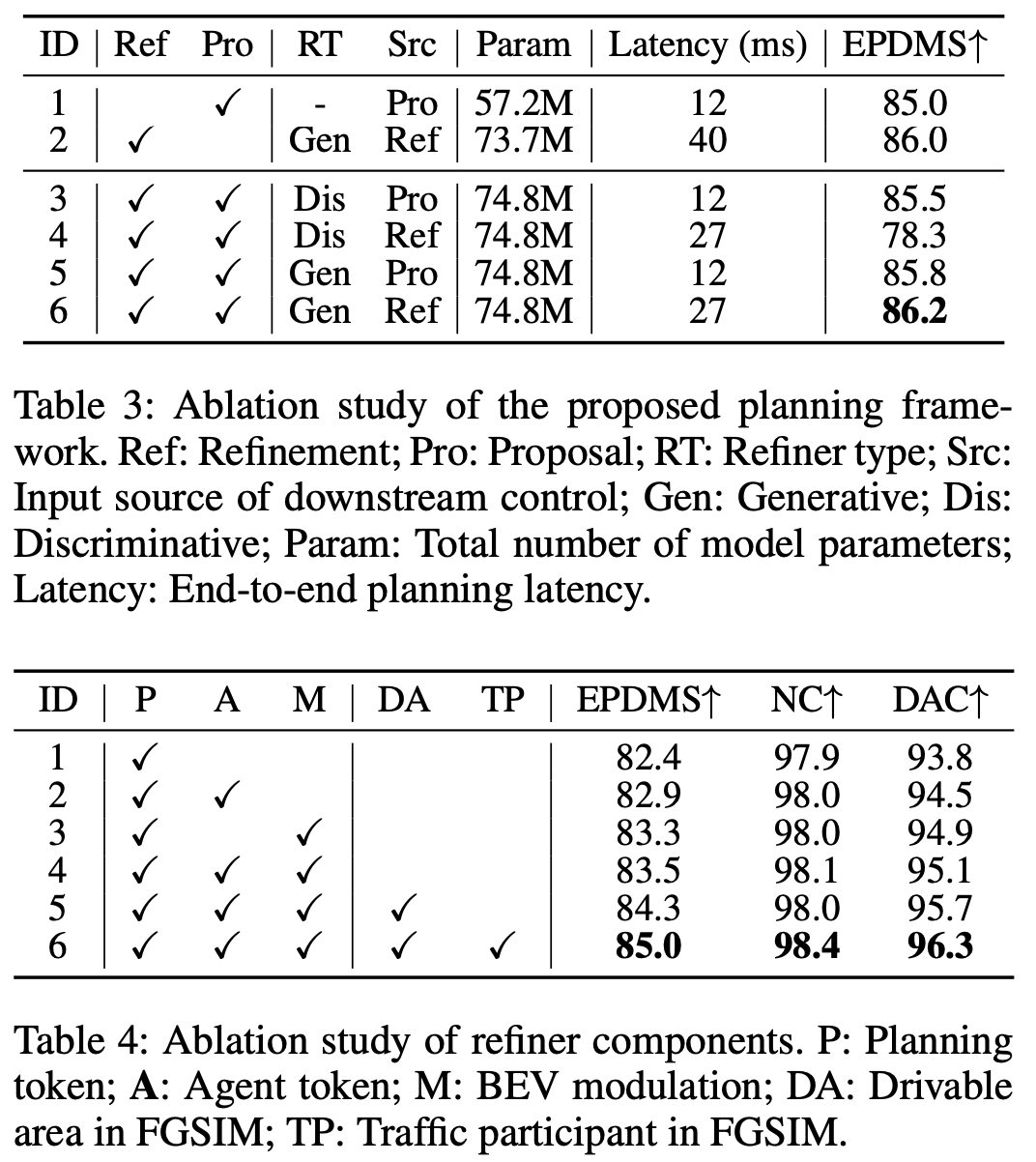 规划框架的消融:表3评估了本文规划框架中每个阶段的影响。第1行和第6行的对比表明,引入细化器使EPDMS提升了1.2,证实其显著提升了轨迹proposal的质量。第2行和第6行进一步表明,更高质量的proposal提高了细化的上限,其中第2行采用两次去噪迭代,而第6行仅使用一次迭代。同时,第1行和第5行表明,适当的细化器监督有助于proposal学习。最后,第4行和第6行的对比突显了本文的生成式细化器相对于判别式替代方案在执行细粒度轨迹调整方面的优势。