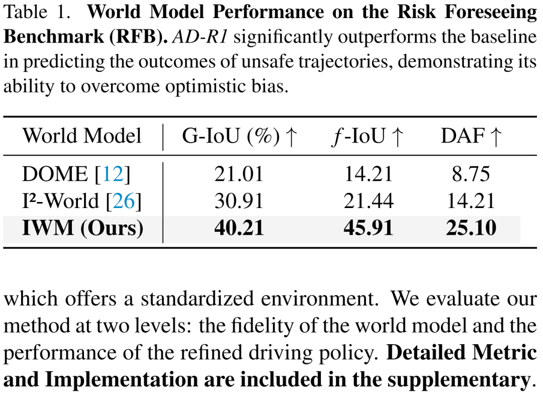 AD-R1在风险预测任务中表现优异:如表1所示,标准世界模型在本文提出的风险预测基准(RFB)上表现显著不佳。仅基于安全数据训练的DOME与