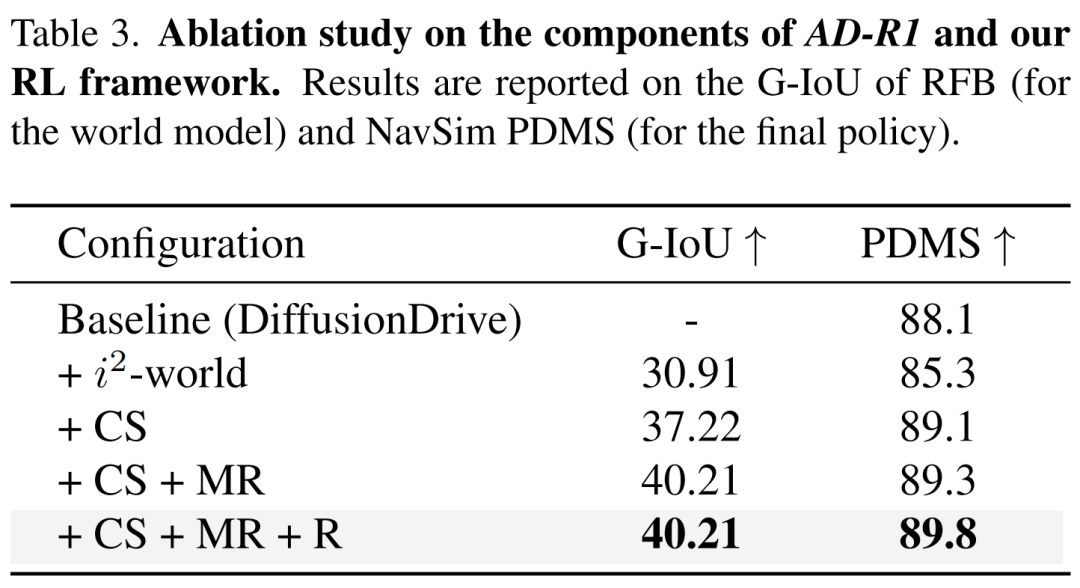4D奖励(R)实现最优性能:最后,在优化循环中引入基于物理的4D奖励(R),PDMS得分达到最高值89.8。这表明,利用3D/4D预测结果构建的细粒度奖励信号,能为策略优化提供更可靠的指导。