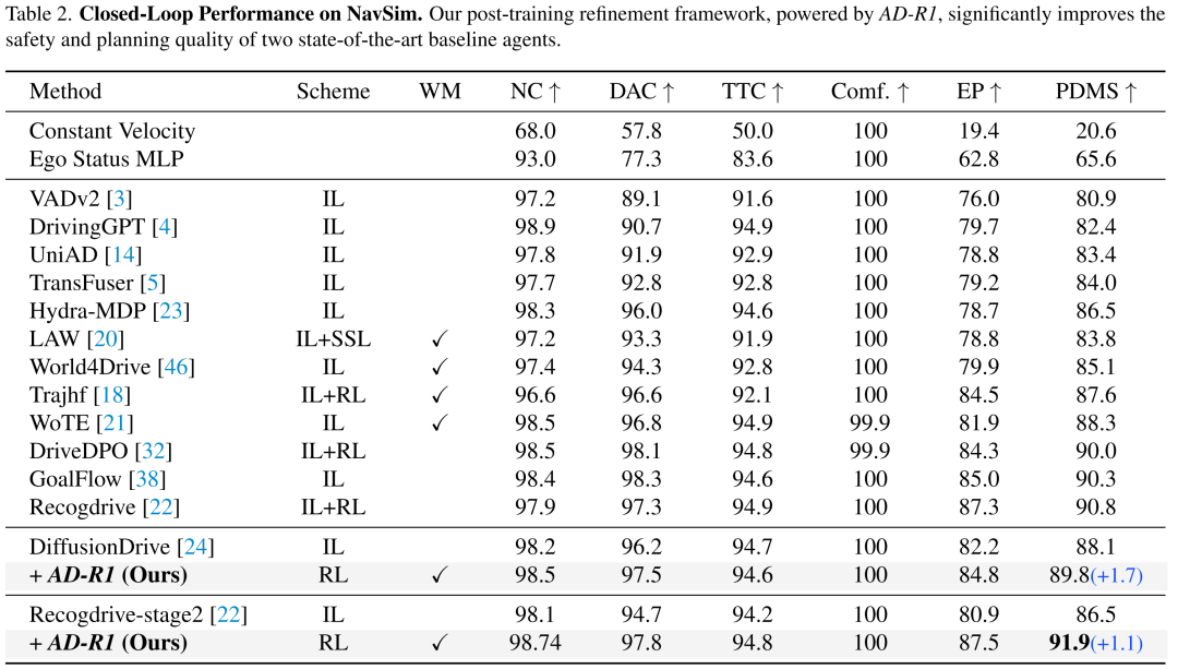 在NavSim仿真器上的大量实验表明,AD-R1具有即插即用的有效性,在两个基线模型上实现了规划指标PDSM绝对提升1.7%。