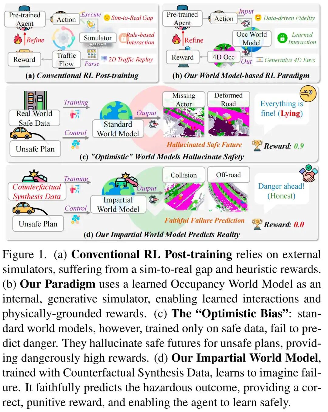 为解决这一问题,澳门大学联合理想汽车等团队提出了一种基于公正世界模型(Impartial World Model)的后训练策略优化框架。核心贡献在于让模型能够如实呈现危险。AD-R1通过一种新颖的数据合成流水线——反事实合成实现这一目标,该流水线系统地生成包含合理碰撞和偏离车道事件的丰富训练样本库。这一转变使模型从被动的场景补全器升级为可靠的预测器,能够严格遵循行为与结果之间的因果联系。随后将该公正世界模型集成到闭环强化学习框架中,使其担任内部评估器的角色。在优化过程中,智能体通过查询评估器“预想”候选行为的结果。通过大量实验(包括在全新的风险预测基准(Risk Foreseeing Benchmark)上的测试),我们证明所提模型在故障预测方面显著优于基线模型。因此,当其作为评估器使用时,能够在复杂仿真场景中大幅减少安全违规事件,这表明教会模型“预想危险”是构建真正安全、智能的自动驾驶智能体的关键一步。