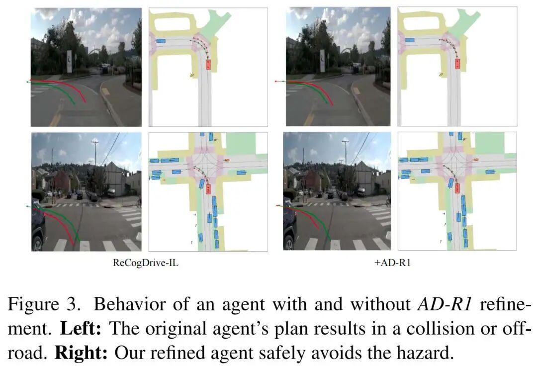 策略优化的行为可视化:图3对比了智能体在应用AD-R1优化前后的行为差异:左侧为原始智能体的规划轨迹,该轨迹会导致碰撞或偏离车道;右侧为经过AD-R1优化后的智能体轨迹,能够安全规避危险。这一直观对比验证了我们的框架在实际危险场景中的决策修正能力。