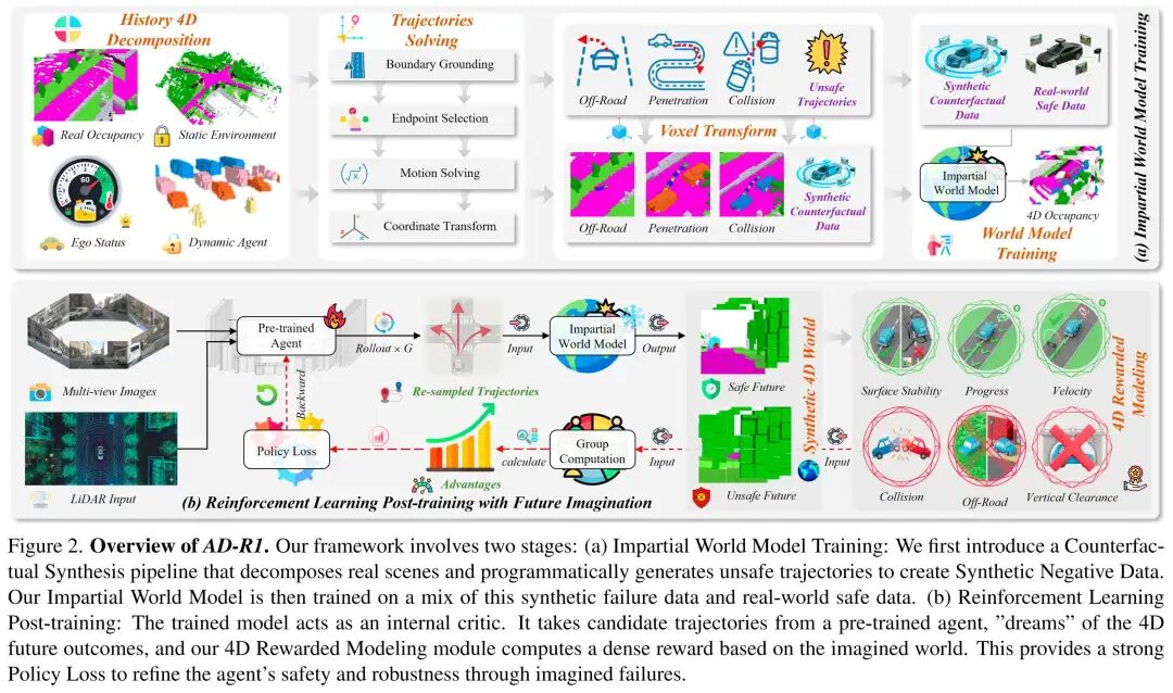 提出AD-R1,全新的强化学习框架,能够直接在完整的4D时空域中实现策略优化。该框架利用生成式占用世界模型作为高保真“预想引擎”,使智能体能够从大量想象的故障中安全学习——这是现实世界自动驾驶的关键能力。