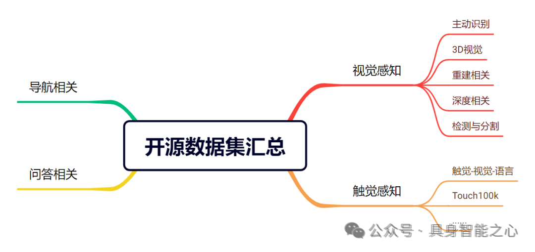 除此之外,还针对具身感知、触觉感知、导航、问答、大模型、视觉语言模型、端到端、机械臂抓取、控制规划多个领域的开源数据集进行了汇总,再也不用担心找不到可用的数据集了。