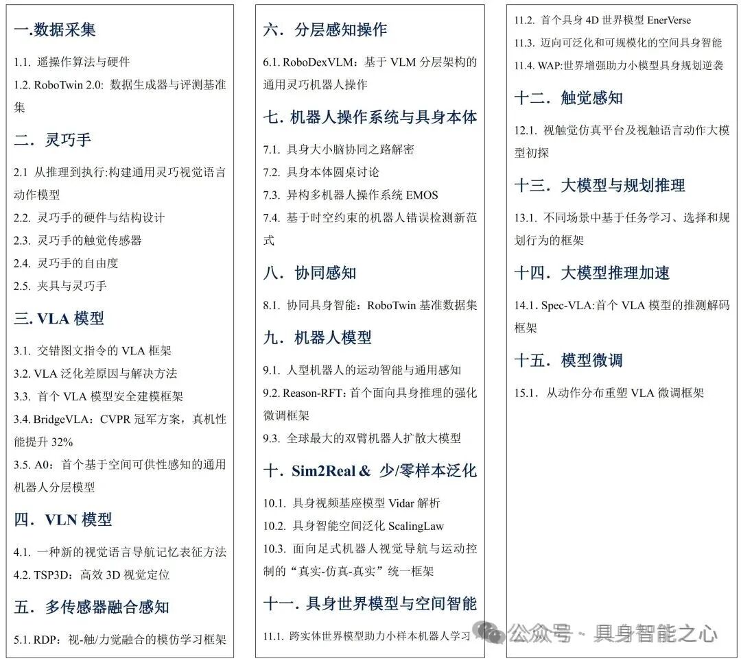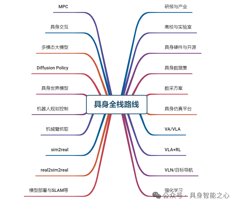 我们为大家汇总了近40+开源项目、近60+具身智能相关数据集、行业主流具身仿真平台、以及各类技术学习路线,包括但不限于:
