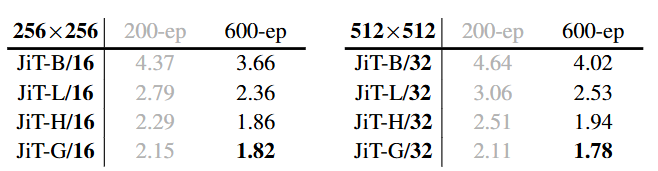 当分辨率提升到 512×512,JiT 同样保持稳定。作者将 patch 尺寸同步扩大为 32×32,使序列长度仍旧维持在 16×16,不随分辨率攀升而变重。结果显示,H/32 模型达到 1.94 的 FID,而 G/32 模型更是达到 1.78,证明在超高维 patch(3072 维)下,x-prediction 仍能保证良好的可训练性。