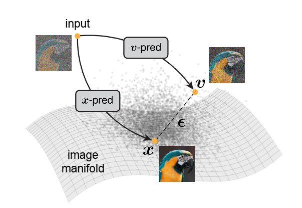 图1|这张图演示了图像生成的核心思想:自然图像通常位于一个低维流形上,而噪声或混合噪声(如图中所示的噪声项与“图像减噪声量”)则散落在高维空间。也正因为干净图像在低维结构中,而噪声是彻底的高维乱流,让模型去预测图像本身和去预测噪声,本质上是两类完全不同的任务