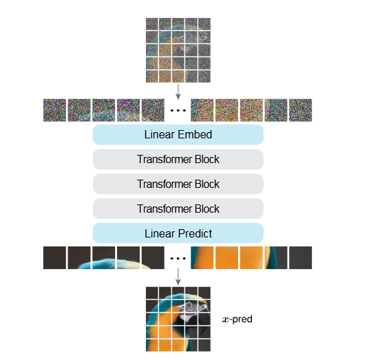 图3|JiT 的结构示意图。它本质上就是一个直接处理像素 patch 的 ViT,不依赖额外模块,模型的输出也是同样大小的像素 patch,用来做干净图像的预测