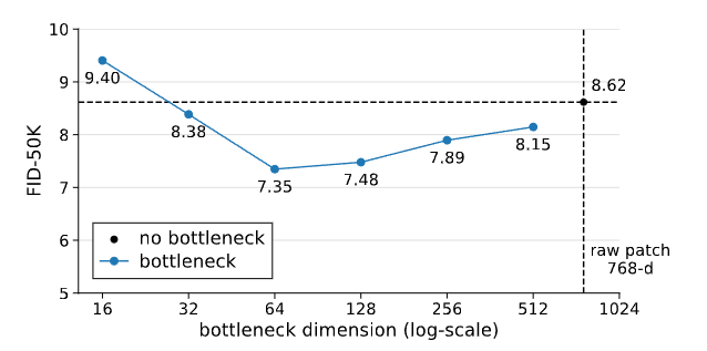 结果:没有任何灾难性退化,反而在某些范围(32~512)显著提升 FID,最小甚至只用 16 维 bottleneck 也没崩溃。