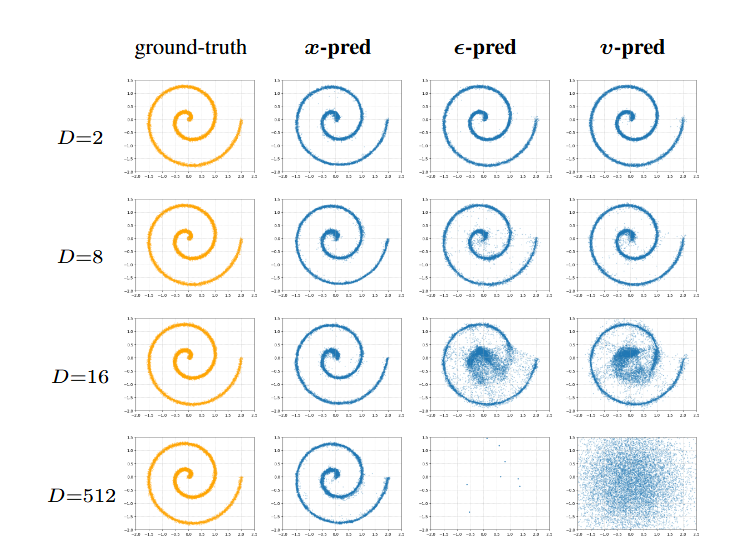 他们把二维数据随机投影到 512 维,让一个小 MLP 按三种方式训练:预测 x、预测 ϵ、预测 v,结果: