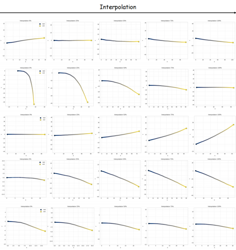 插值: 潜在空间的线性插值能产生平滑的轨迹过渡,证明了潜在空间的光滑性(参见下图)。