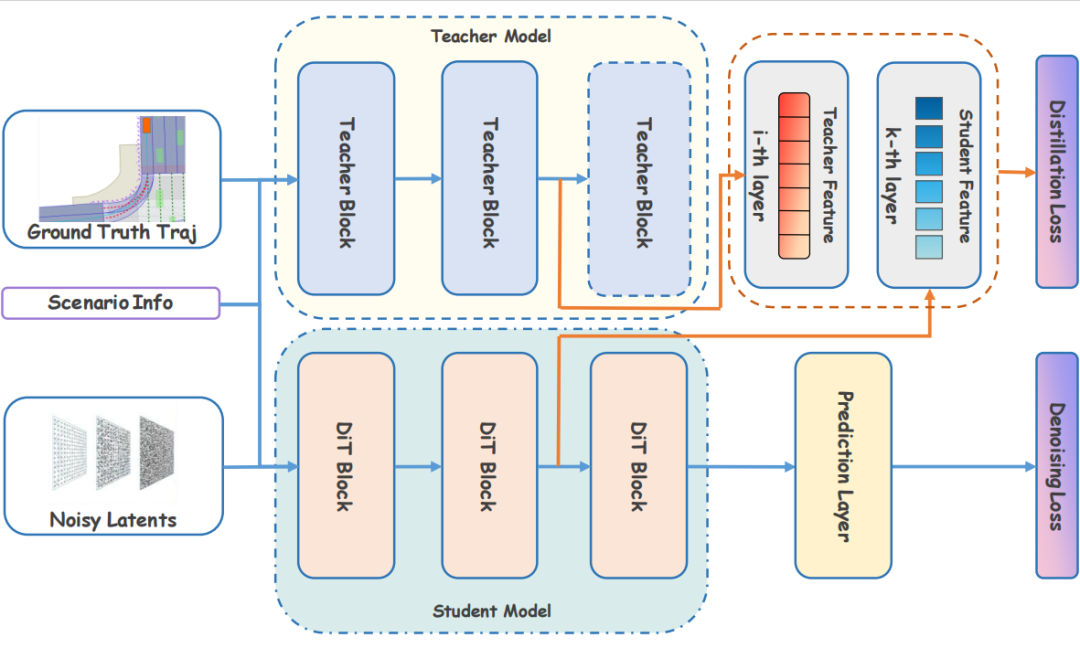 总损失为 。这可以为学生模型的中间层特征提供一个已经编码完美(良好的规划–场景交互与对齐)的“模板”,从而降低学生模型中规划空间与向量化输入空间的交互“难度”,引导更好的特征融合。由于已经有工作证实:像素扩散模型自身就是很好的 image-condition 对齐编码器,因此我们直接使用像素空间规划器 Diffusion Planner 作为教师模型。