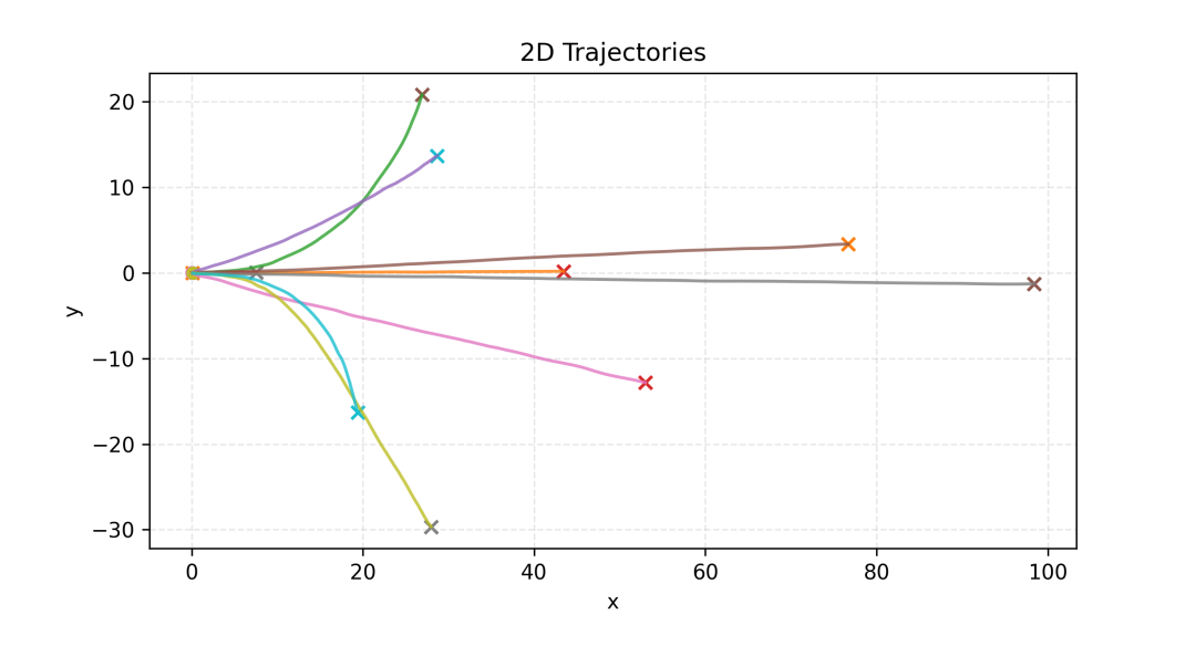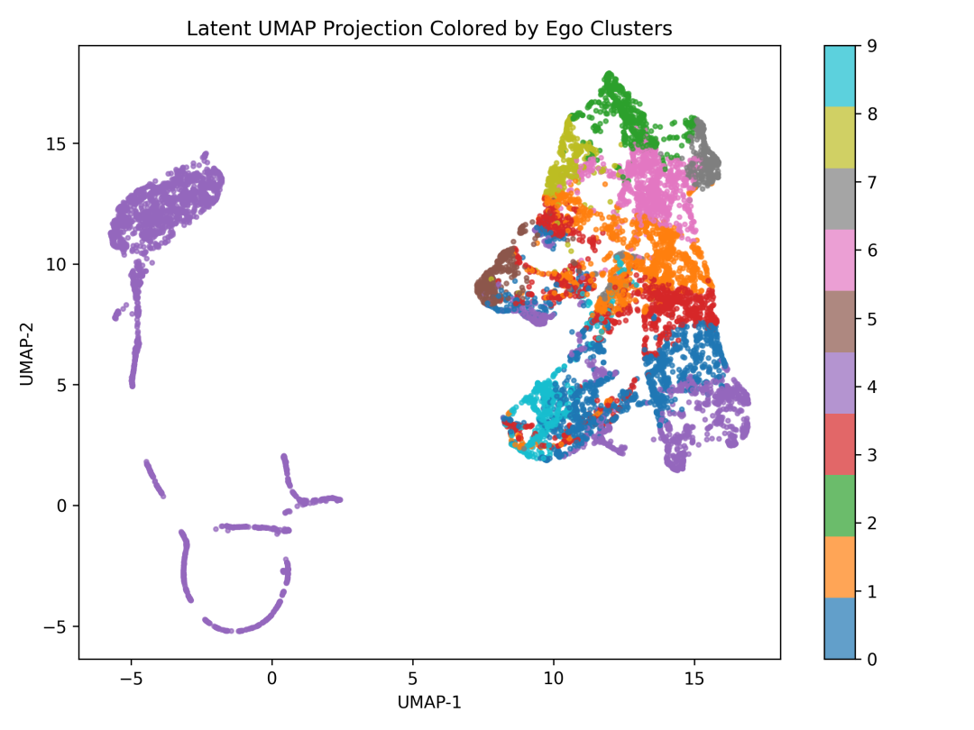 降维可视化: 在原始轨迹空间聚类得到“意图”标签,随后用 UMAP 对潜在空间降维并用对应意图染色,结果显示不同区域基本分离开,说明潜在空间结构与意图对齐良好(参见下图)。