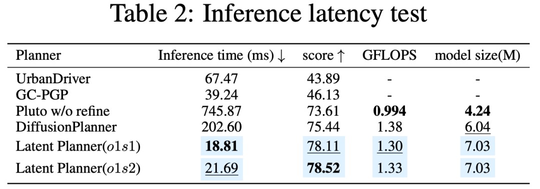 推理速度: 如表2所示,相比于之前的 SOTA 方法 Diffusion Planner(需迭代 10 步),LAP 受益于潜在空间的紧凑性,仅需 2 步 采样即可生成高质量轨迹,实现了最高 10 倍 的推理加速。