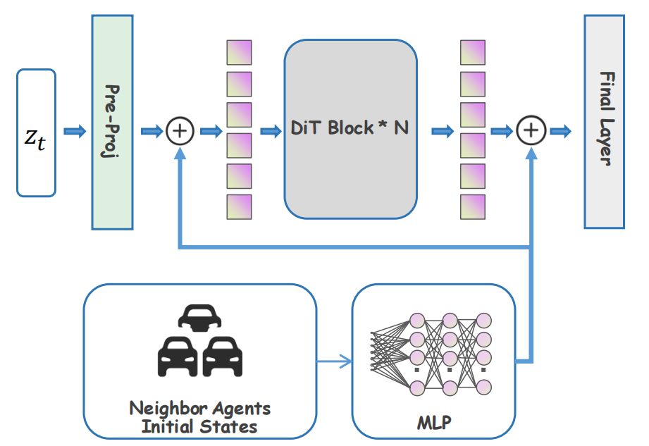 初始状态注入 (Initial State Injection, ISI): 由于周车的起点并不固定,我们发现不添加额外信息会导致模型对周车的预测无法收敛。因此,我们将周车的初始状态 注入到 DiT 的输入和输出层,为预测周车轨迹提供一个明确的先验“锚点”。