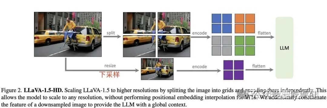 如 LLaVA-1.5-HD 的架构所示,它没有改动模型内部,而是在数据预处理阶段进行了一次巧妙的“分兵”:一路将高清图像切块 (split),以保留局部细节;另一路将高清图像降采样 (resize),以提供全局上下文。最终,这两路信息被拼接在一起送入 LLM,使其既能“明察秋毫”,又能“高瞻远瞩”。