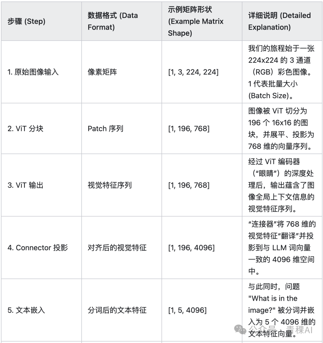 如上图表格的第 3 步和第 4 步所示,连接器接收了 ViT 输出的 [1, 196, 768] 维特征,并将其转换为了 [1, 196, 4096] 维的“对齐后视觉特征”。这不仅仅是维度的改变,更是一次深刻的语义空间映射。
