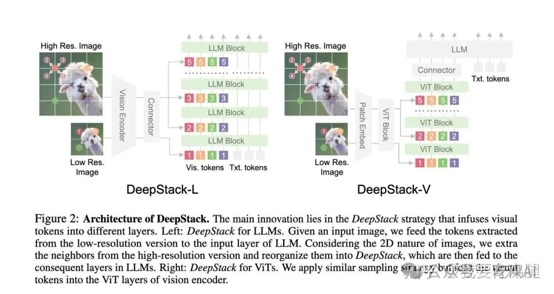 • DeepStack-V (for ViTs): 这是将视觉信息注入到视觉编码器(ViT)自身的版本。整个注入过程都发生在 ViT 内部,旨在视觉编码阶段就构建一个多尺度的层次化视觉表征。